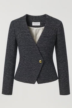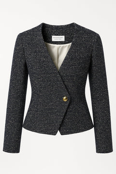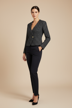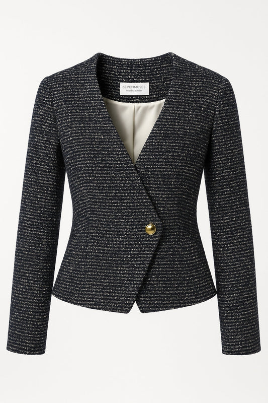 Zamansız bir stilin vazgeçilmezi olan Black Tweed Ceket, dokulu kumaşı ve sofistike duruşuyla modern şehirli kadının stilini tamamlıyor.