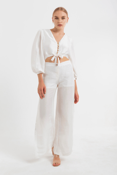 Çift Yırtmaç detaylı İpek Pantolon, %80 saf ipek ve %20 organik ketenden üretilmiştir.