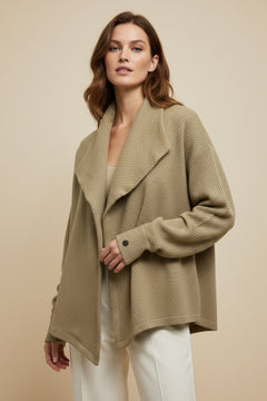 Dokulu yün karışımlı kumaşı sayesinde hem yapısal bir duruşa hem de yumuşak bir sıcaklığa sahiptir — vücudu nazikçe sararak konfor sunar.