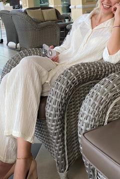 %50 ipek ve %50 organik pamuktan gibi nadir bir kumaş karışımdan üretilen Kelebek İpek Pantolon, özel bir üretim sürecinden geçer ve eşsiz bir yumuşaklık kazanır.