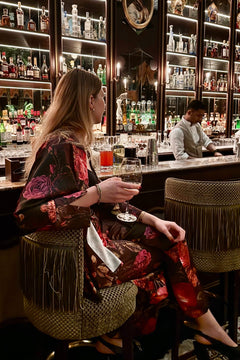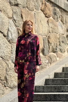 Nostaljik Çiçekli Geniş Paça Saten Pantolon, yüksek bel kesimi ve dökümlü siluetiyle vücudu zarifçe saran bu pantolon, 1940’ların gece stilinden ilham alarak modern yorumuyla yeniden tasarlandı.