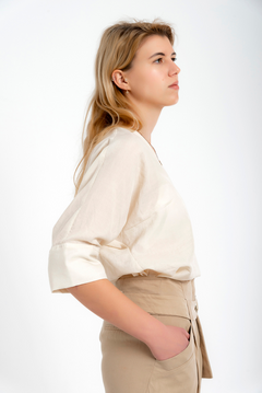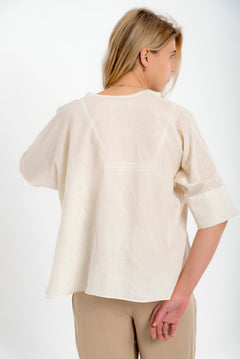 %50 saf el dokuması ipek ve %50 organik pamuktan oluşan uyumlu bir karışımla özenle üretilmiştir. Oversize (bol) kesimi sayesinde rahatlıkla şıklığı bir araya getirir.